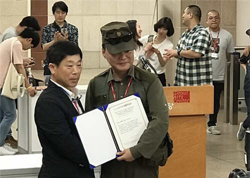 韩国雕刻家协会会长韩镇燮给艺术家龙翔颁发参展证书