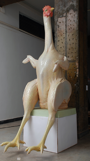 人与物的关系,其实是一个古老的、永恒的议题,“冻·酷”展 在提示人们当下社会问题的同时展示了人类对于“鸡”或者诸如此类的物体的强制性控制和把玩,这些都在作品的形态处理、大小尺度以及制作上反映了出来,这种揭示姿态无所谓正面和负面,作者把问题提出就足以表达。